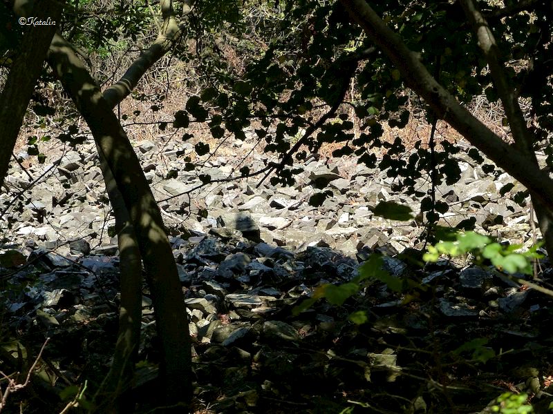 a Kisfaludy-házig kellett eljutnunk. Már ez is egy szép út volt, meredek és jó napos, sehol egy fa, ami árnyat adna. Innen a piros jelzésen megkerültük a háromnegyed hegyet, egykori bazaltbányák mentén, abban a reményben, hogy elhaladunk majd itt is bazaltoszlopok, sziklák mellett. Néhol látszottak is az erdő mélyén, fák takarásában, de közelebb menni hozzájuk nem lehetett. Viszont számos bazaltlépcsőt kellett itt is megmásznunk.